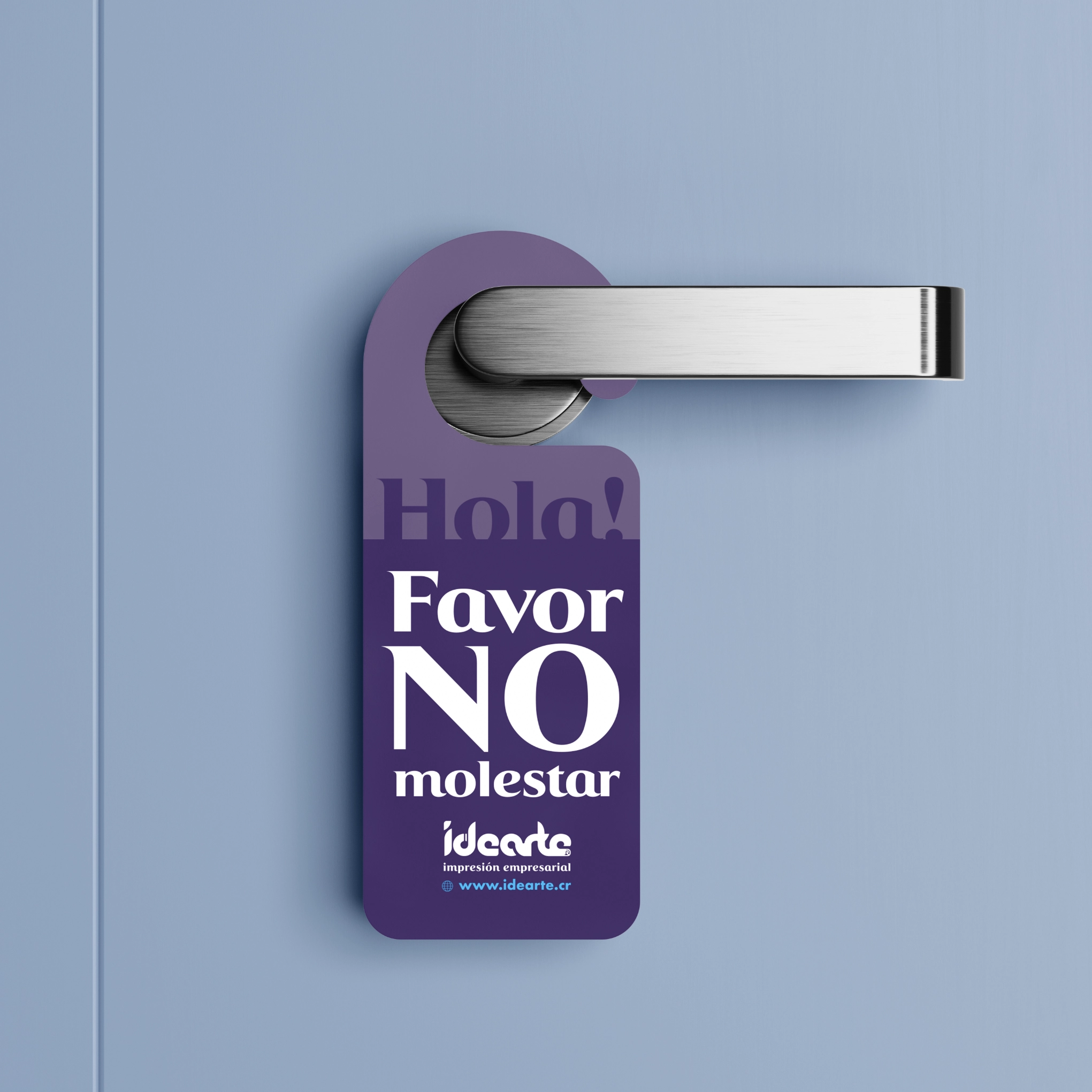 Colgante de puerta fabricado acrílico, poliestireno y cartón 10-x-20 cm, diseño personalizado.